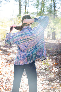 This jacket is a unique, one-off piece – you’ll never meet anyone wearing this exact jacket! Reversible for versatility, one side features functional pockets, and the other showcases unique prints and textures, allowing you to style it your way. Crafted from vintage kantha quilt, this jacket repurposes layers of reclaimed cotton fabrics and saris, originally hand-quilted with intricate running stitches. Marks, fraying, and patches add character, while repairs and creative repurposing preserve its charm. Block-printed motifs complete this exceptional piece, blending tradition and artistry into a wearable treasure.