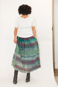 Crafted from handpicked vintage kantha quilts, each skirt is truly one-of-a-kind. The flowing midi circle silhouette moves with ease, while frayed edges and visible patches add character rather than conceal it. These details are not flaws, but the essence of its appeal.