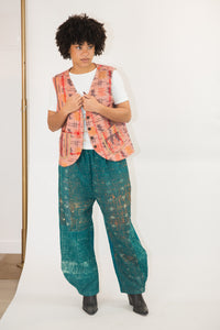 Patina Pants are one-of-a-kind, cut from handpicked vintage kantha quilts so no two are ever alike. A relaxed silhouette with an elastic-and-drawstring waist, side pockets, and buttoned hems offers ease and versatility - wear them loose, tapered, or cuffed to reveal contrasting fabric inside.