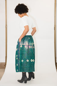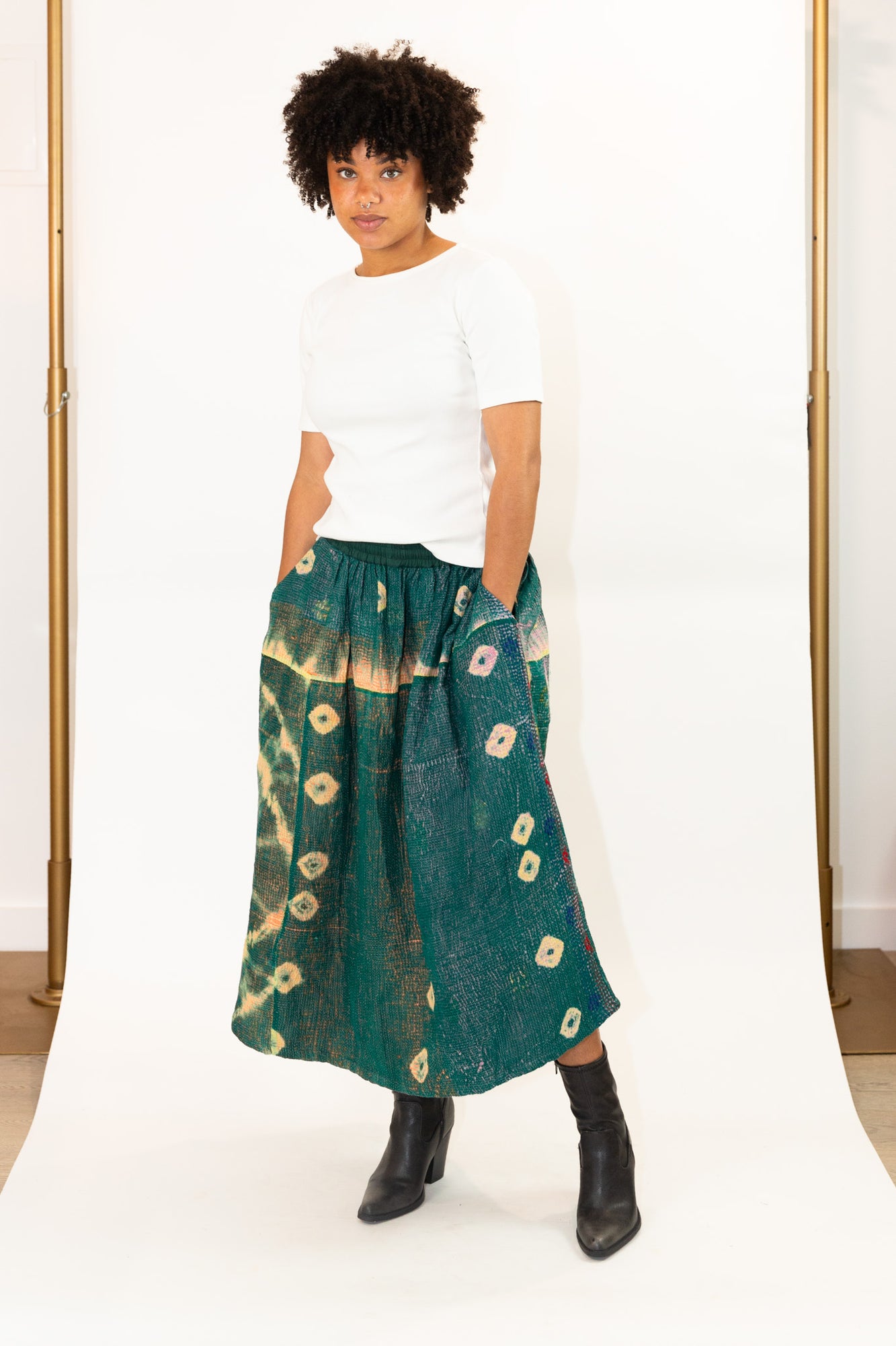 Crafted from handpicked vintage kantha quilts, each skirt is truly one-of-a-kind. The flowing midi circle silhouette moves with ease, while frayed edges and visible patches add character rather than conceal it. These details are not flaws, but the essence of its appeal.