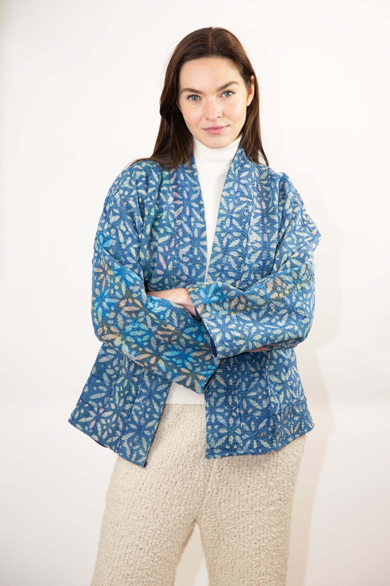 This jacket is a unique, one-off piece – you’ll never meet anyone wearing this exact jacket! Reversible for versatility, one side features functional pockets, and the other showcases unique prints and textures, allowing you to style it your way. Crafted from vintage kantha quilt, this jacket repurposes layers of reclaimed cotton fabrics and saris, originally hand-quilted with intricate running stitches. Marks, fraying, and patches add character, while repairs and creative repurposing preserve its charm. Block-printed motifs complete this exceptional piece, blending tradition and artistry into a wearable treasure.
